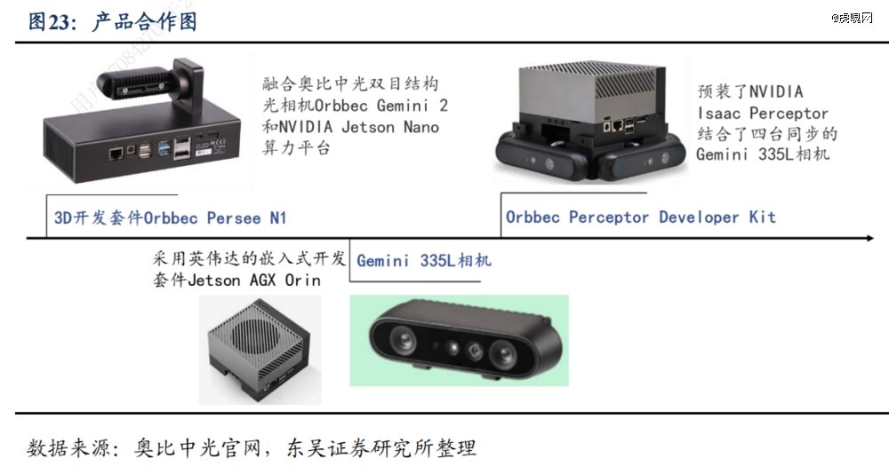 奥比中光与英伟达先后合作开发了 3D 开发套件 OrbbecPerseeN1 与 OPDK 套件,可广泛 应用于 AMR、无人机、机械臂控制等,展现出灵活的场景适应性,显著提升了 AMR 的识别与导航能力。