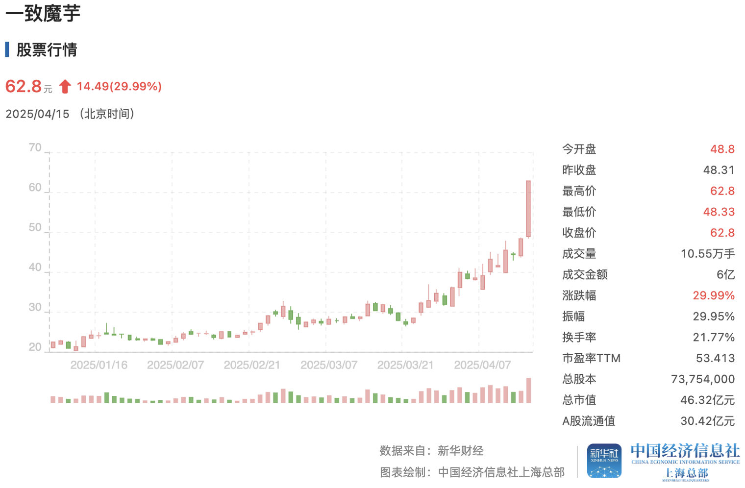 新华财经上海4月16日电(林郑宏、周西仑) 以“吃喝玩乐”为代表的大消费方向成为近期A股市场的主线之一。其中休闲食品领域“牛股”辈出,北交所人气股一致魔芋更是不断刷新历史高点,风头无两。