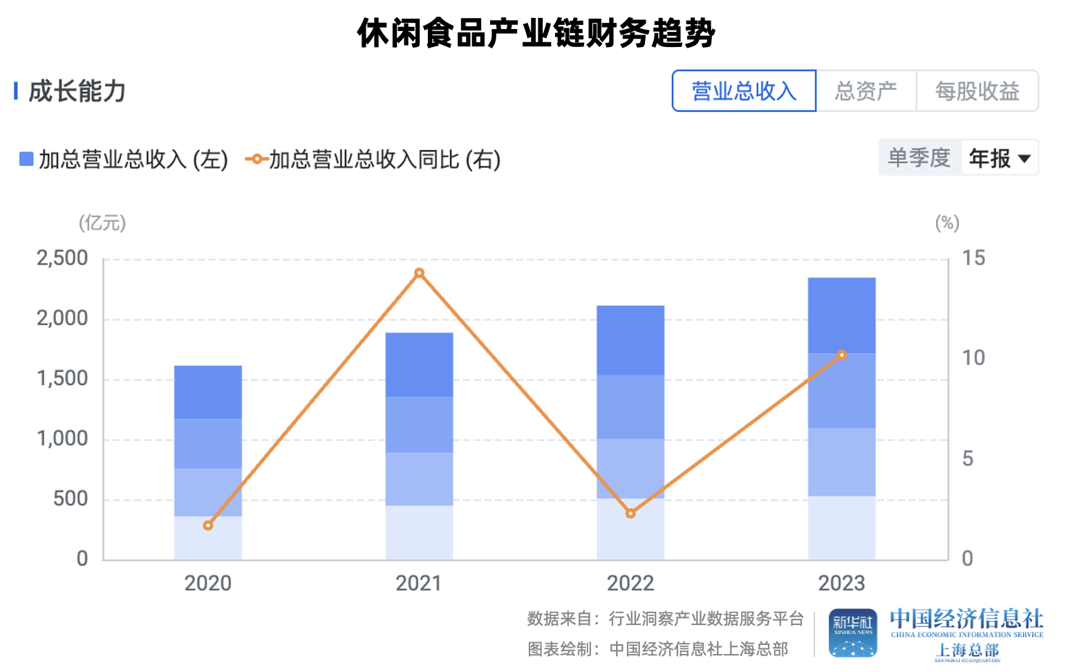 行业洞察系统数据显示,国内休闲食品行业近年来总体营收不断走高,2023年已达2342亿元,较2020年增长近五成。而从已公布2024年全年业绩的休闲食品公司如有友食品、劲仔食品的数据来看,扣非后净利均实现了四成左右的高速增长。