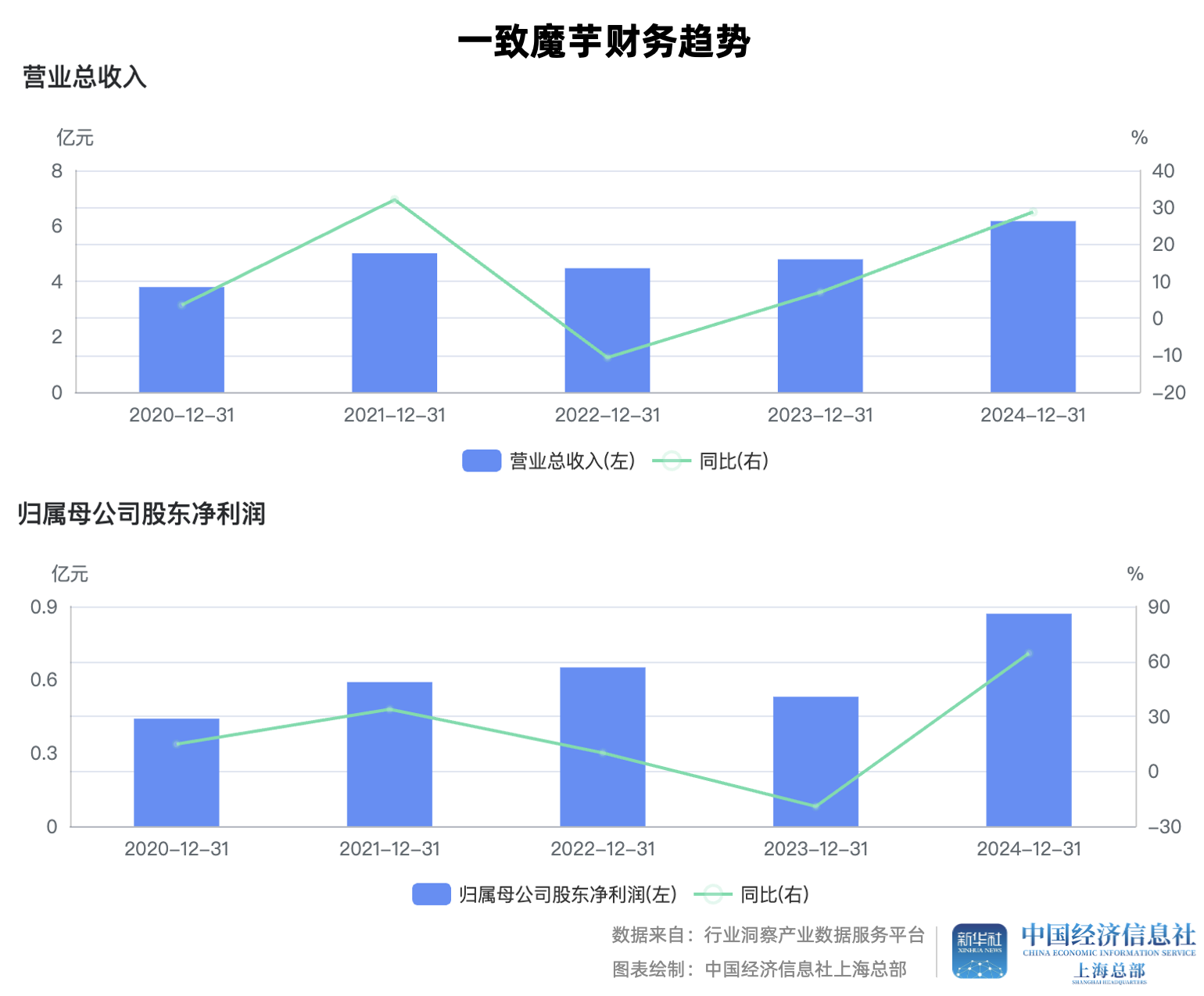 而从近年财务情况来看,一致魔芋的营收、净利保持稳定向上,2024年更是双双创下历史新高,且同比增速分别达到28.76%和64.41%。