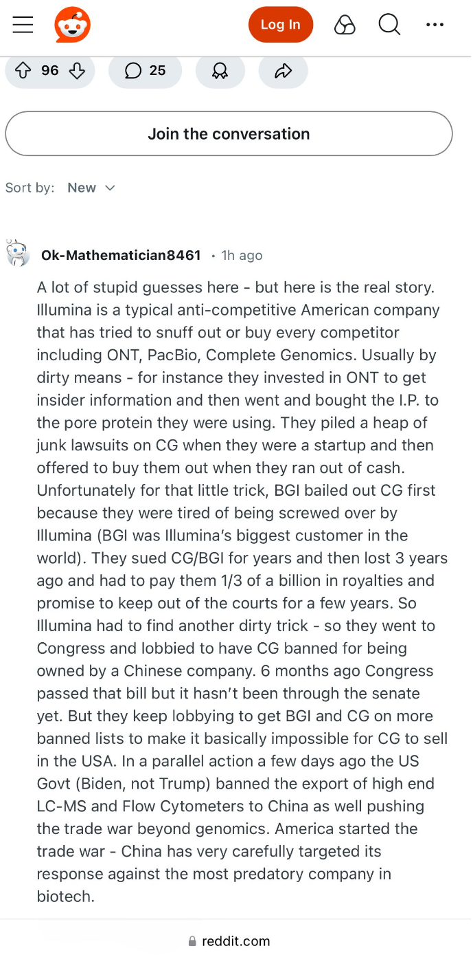因美纳在华市占率降到了13.59%。在美国,这家公司的日子也不好过,市值跌的就剩100多亿美元了。有美国网友在平台直言,“真不知道,这种没信用的公司存在的意义在哪?”