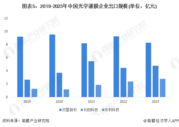 从企业出口规模来看,2019-2023年,中国光学薄膜代表性企业双星新材、长阳科技、东材科技产品出口表现呈现分化,双星科技、长阳科技出口规模有所回落,东材科技出口规模波动增长,由此可见,中国光学薄膜企业出口竞争日益激烈。