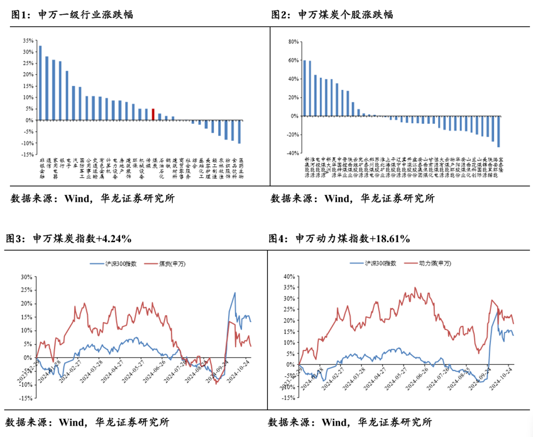 截至2024年10月31日,申万一级煤炭行业指数较沪深300指数下跌9.16pct,其中动力煤/焦煤/焦炭分别较沪深300指数+5.21/-29.05 /-32.71pct,年初截至2024年10月31日,区间涨幅排名前五的个股为,新集能源、淮河能源、电投能源、中煤能源、新大洲A。