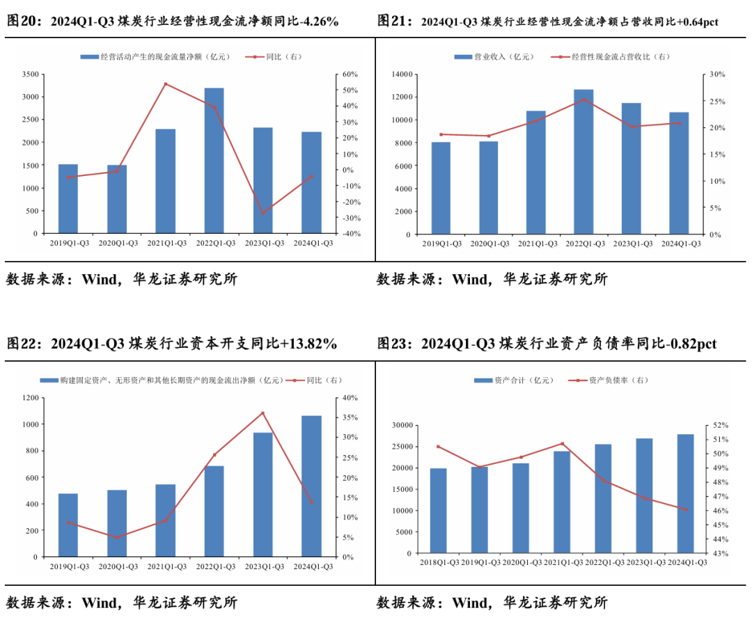 2024Q1-Q3运营效率整体有所下降。煤炭行业上市公司经营性现金流净额2,222.74亿元,同比-4.26%,共有13家公司经营性现金流净额同比增加,同比增幅排名前5的有:美锦能源、安源煤业、淮河能源、郑州煤电、安泰集团,行业经营性现金流净额占营收比为20.82%,同比+0.64pct;