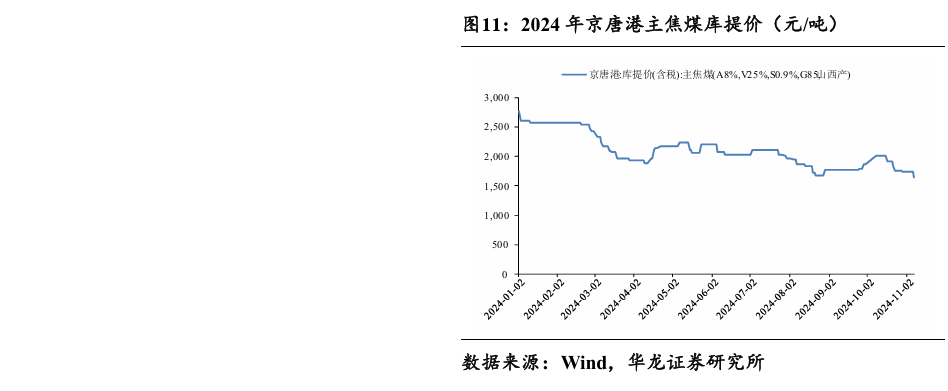 2024Q3煤炭行业运行总体平稳,煤炭价格先降后升,秦皇岛港5500大卡动力煤平仓均价约848.09元/吨,同比下降约2.09%;京唐港主焦煤库提价为1,893.79元/吨,同比下降约10.98%。
