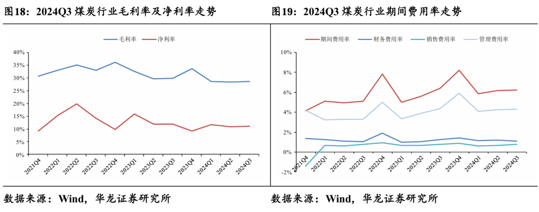 2024Q3盈利能力同环比下降,期间费用小幅回升。盈利能力方面,2024Q3煤炭行业上市公司毛利率28.66%,同比-1.13pct,环比+0.19pct,电投能源、淮河能源、新集能源、兖矿能源、晋控煤业、中国神华、郑州煤电、甘肃能化、山煤国际、大有能源、冀中能源、上海能源,12家公司单季度毛利率同比上涨;2024Q3煤炭行业上市公司净利率11.09%,同比-0.72pct,环比+0.24pct,陕西煤业、昊华能源、中煤能源、淮河能源、甘肃能化、兖矿能源、永泰能源,7家公司单季度净利率同比上涨。期间费用方面,2024Q3煤炭行业上市公司财务费用率1.10%,同比-0.16pct,环比-0.12pct;销售费用率0.80%,同比+0.02pct,环比+0.12pct;管理费用率4.31%,同比-0.04pct,环比+0.05pct;期间费用率6.22%,同比-0.17pct,环比+0.04pct。