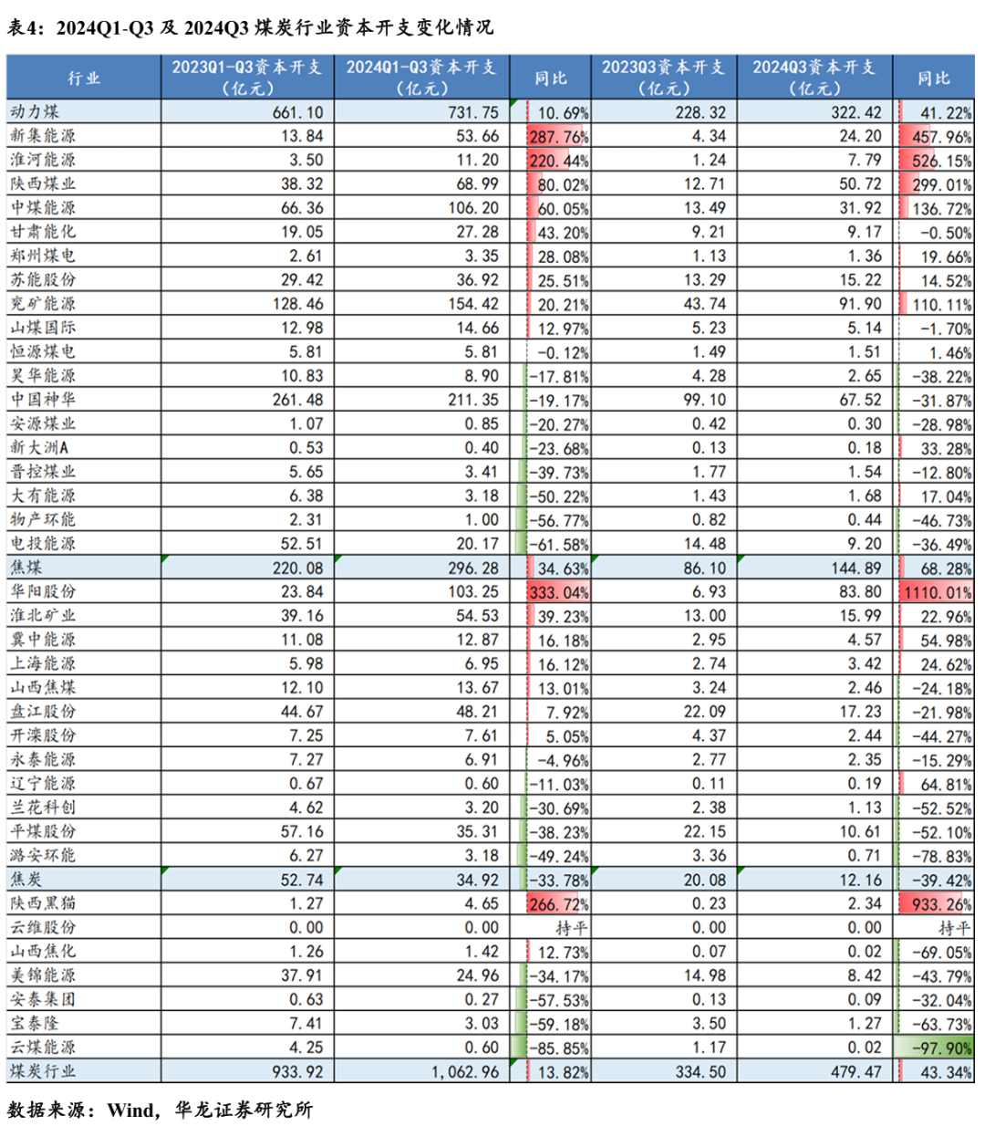 行业子板块现金流分化明显。动力煤/焦煤/焦炭板块,2024Q1-Q3分别实现经营现金流量净额1903.11/320.60/-0.98亿元,同比+4.12%/-35.45%/流出减少。