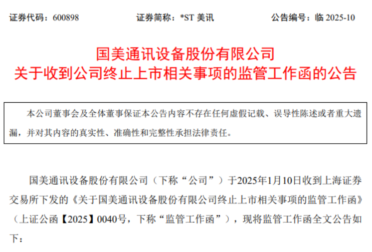 国美通讯设备股份有限公司(*ST美讯)近日公告,公司已收到上海证券交易所下发的告知书,根据相关规定,公司已经连续20个交易日收盘总市值低于5亿元,股票已经触及终止上市情形。