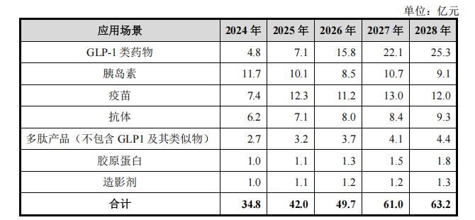 据汉邦科技提交的资料显示,国内生产级液相色谱设备的市场需求将主要来自 GLP-1 类、抗体、疫苗、胰岛素等药物的生产及相关的 CDMO 服务。概括来说,公司基于不同应用场景的生产级色谱系统单价、新增设备数量(结合色谱纯化系统渗透率、单个产品所需产线数量、单个产线系统配置量等估算)、新增药品获批数量(基于三年前临床试验数量推算)等数据推算,未来几年医药领域主要应用场景的生产级色谱设备市场需求如下:
