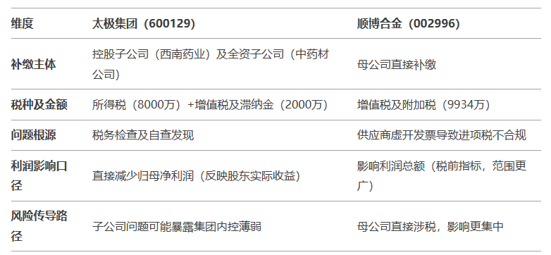 两家公司均因税务问题需补缴税款,太极集团涉及子公司所得税和增值税,顺博合金因供应商虚开发票导致增值税不合规,反映出企业税务管理存在漏洞。