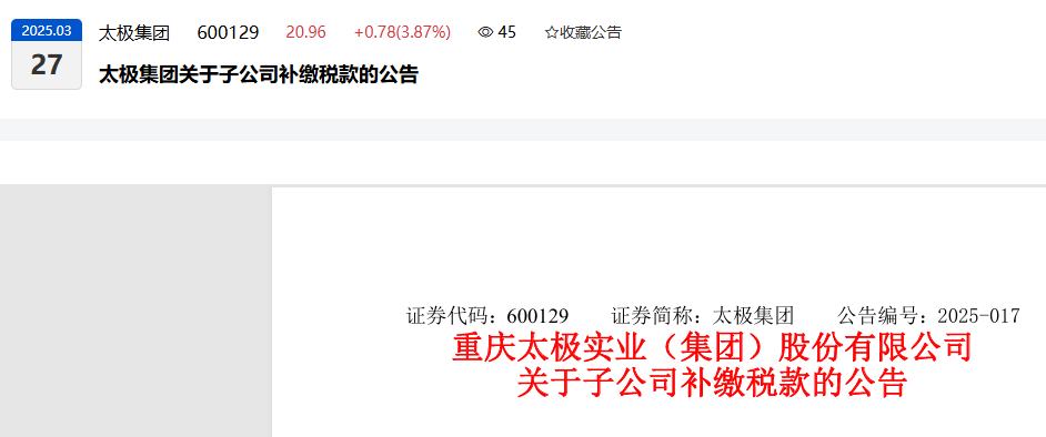2025-03-27太极集团600129太极集团关于子公司补缴税款的公告