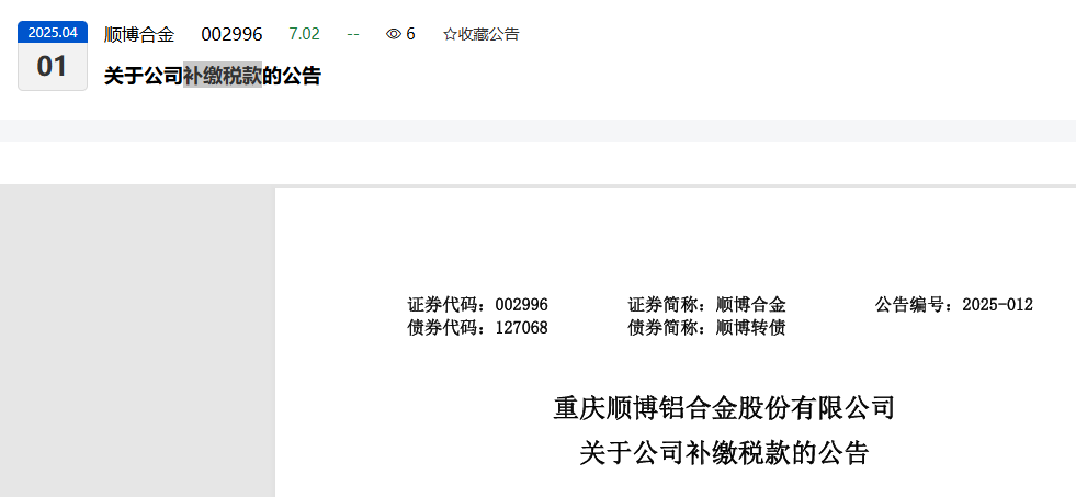 2025-04-01顺博合金002996关于公司补缴税款的公告