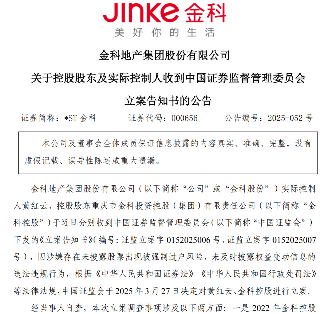 近日,据金科股份公告披露,公司实际控制人黄红云、控股股东重庆市金科投资控股(集团)有限责任公司(以下简称金科控股)于近日分别收到中国证监会下发的《立案告知书》,因涉嫌存在未披露股票出现被强制过户风险、未及时披露权益变动信息的违法违规行为,中国证监会于2025年3月27日决定对黄红云、金科控股进行立案。