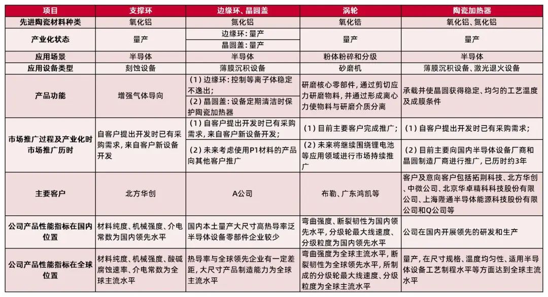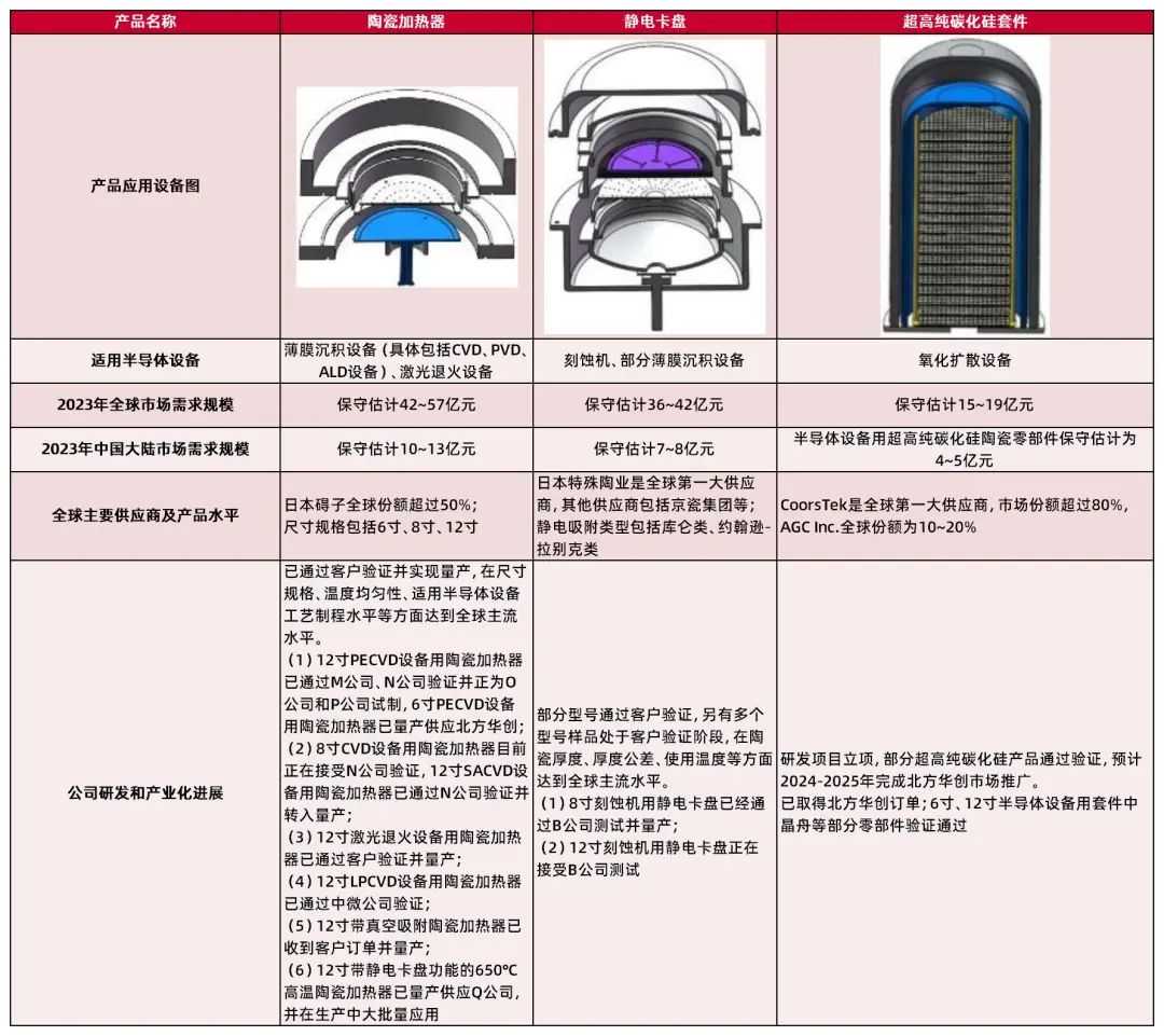 资料来源:公司招股说明书,山西证券研究所公司陶瓷结构件多项“卡脖子”产品技术指标领先,实现国产替代。先进陶瓷材料零部件方面,公司系国内少数掌握半导体设备用先进陶瓷零部件从材料配方到零部件制造全工艺流程核心技术并实现境外规模销售的企业之一,在本土半导体先进结构陶瓷企业中处于市场领先地位。公司先进陶瓷材料零部件产品多项关键技术指标达到国内领先、国际主流水平,推动半导体设备用高纯度氧化铝、高导热氮化铝和分级机用分级轮等多项“卡脖子”产品实现国产替代,填补了中国本土企业在先进陶瓷行业的空白。在陶瓷加热器方面,公司通过承担国家“02专项”之“PECVD设备用陶瓷加热盘的关键技术与产业化”项目课题以及多年研发,目前已探索形成陶瓷加热器自主可控的生产能力,正在积极推进陶瓷加热器、静电卡盘和超高纯碳化硅套件等高精尖产品的研发和产业化。公司已通过A公司、北方华创、中微公司、Q公司、屹唐股份、拓荆科技、上海微电子、上海华力微、三安光电等众多国际和国内知名客户的认证或验证,在泛半导体先进陶瓷领域树立了良好的口碑。
