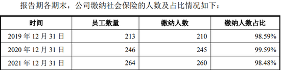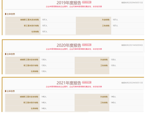 另外,公司披露的缴纳社保人数或存在虚增。招股书显示,2019-2021年,其参保人数分别为210、245人和260人,跟根据国家企业信用信息公示系统显示,2019年-2021年,缴纳社保人数分别为107人、130人和140人,分别多出了103人、115人和120人