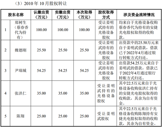 招股书,郑树生100万元的出资款自于光格设备收购蔡春香代为持有的安捷光电股权取得的收购款。魏德刚、尹瑞城均来自于对姜明武的借款。张洪仁、陈翔均是部分来自于转让安捷光电股权取得的收购款,部分来自于自有资金。