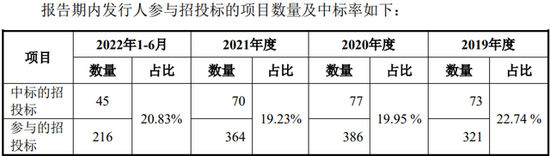招股书披露,报告期内公司通过公开招投标、邀请招投标、竞争性谈判、单一来源等不同业务获取方式的确认收入金额,其中,主要收入还是通过公开招投标,报告期内,其通过该方式取得收入的金额分别为4,081.45万元、8,636.02万元、11,558.50万元和6,504.05万元,占比分别为35.50%、44.30%、41.29%、64.92%。不过,公司的中标率仅维持在20%左右。