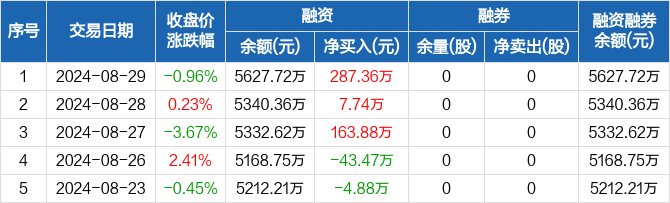 融资方面,当日融资买入417.65万元,融资偿还130.29万元,融资净买入287.36万元,连续3日净买入累计458.98万元。融券方面,融券卖出0股,融券偿还0股,融券余量0股,融券余额0元。融资融券余额合计5627.72万元。