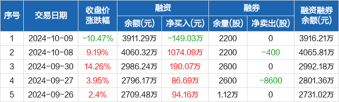 融资方面,当日融资买入659.62万元,融资偿还808.65万元,融资净偿还149.03万元。融券方面,融券卖出0股,融券偿还0股,融券余量2200股,融券余额4.91万元。融资融券余额合计3916.21万元。