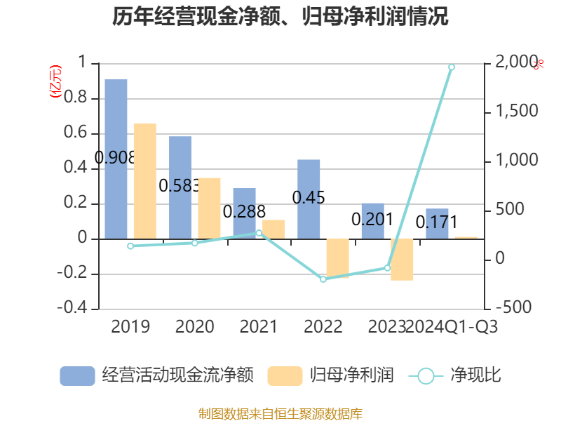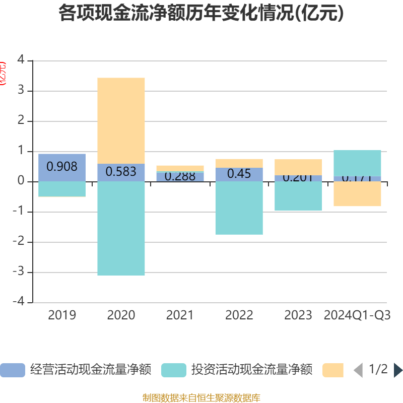 2024年前三季度,公司经营活动现金流净额为1713.41万元,同比增长10.33%;筹资活动现金流净额-8192.92万元,同比减少1.57亿元;投资活动现金流净额8632.5万元,上年同期为-8807.06万元。