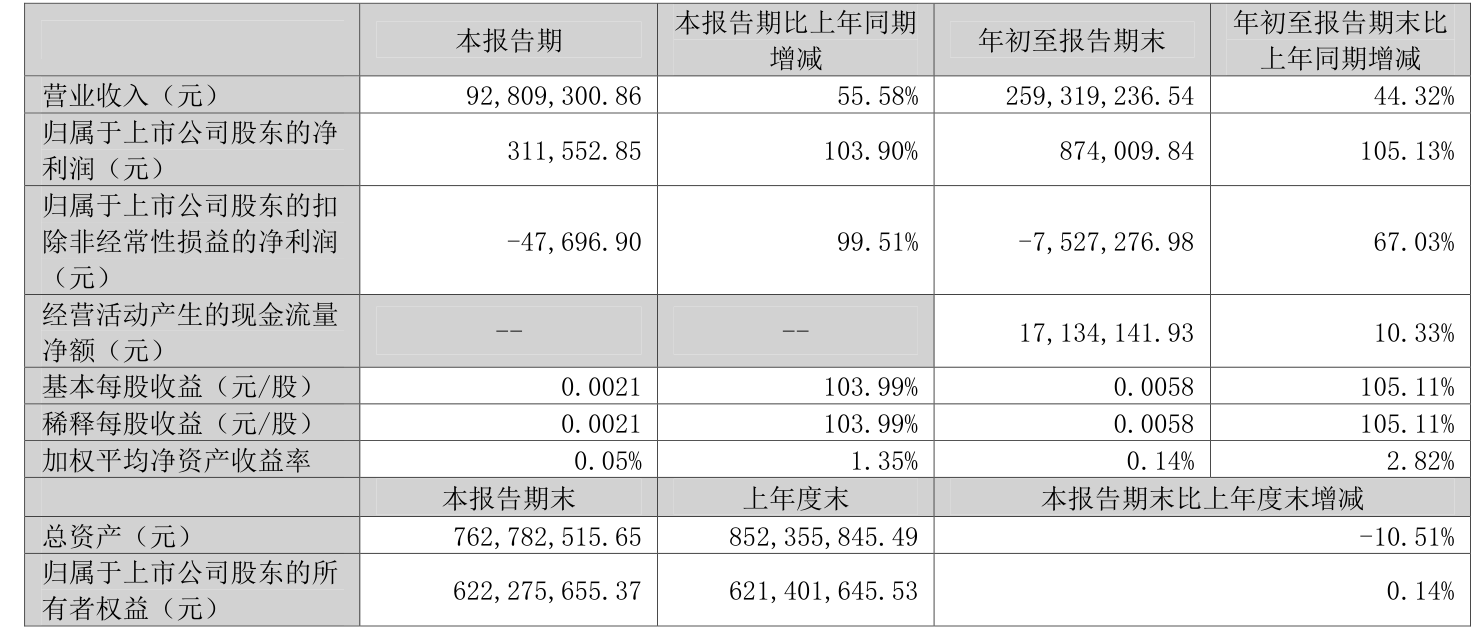 中证智能财讯锦盛新材(300849)10月30日披露2024年第三季度报告。前三季度公司实现营业收入2.59亿元,同比增长44.32%;归母净利润87.4万元,同比扭亏;扣非净利润亏损752.73万元,上年同期亏损2283.05万元;经营活动产生的现金流量净额为1713.41万元,同比增长10.33%;报告期内,锦盛新材基本每股收益为0.0058元,加权平均净资产收益率为0.14%。
