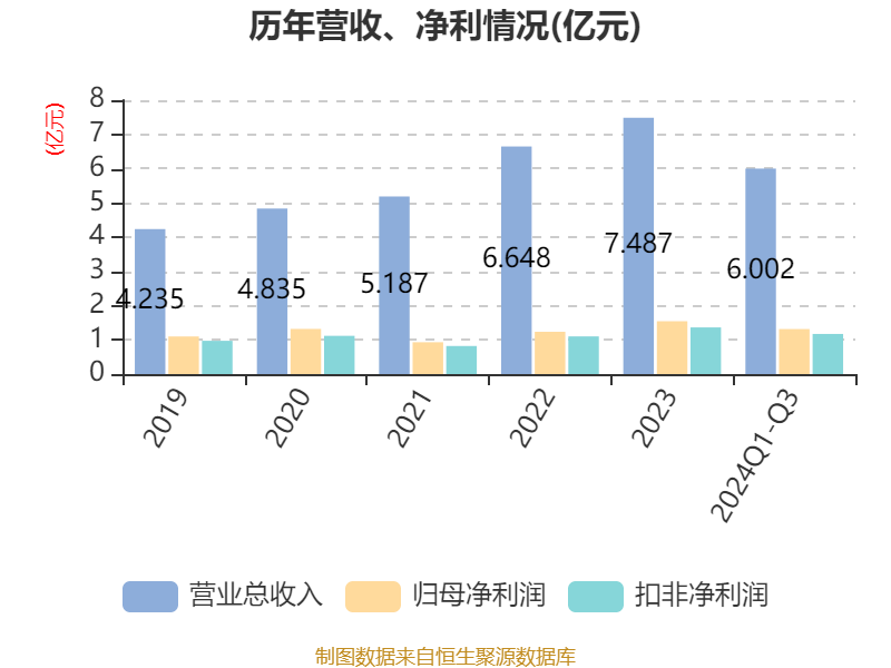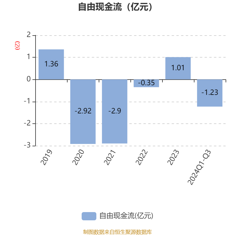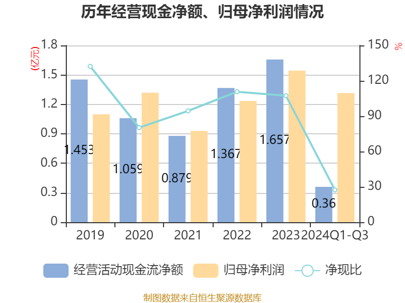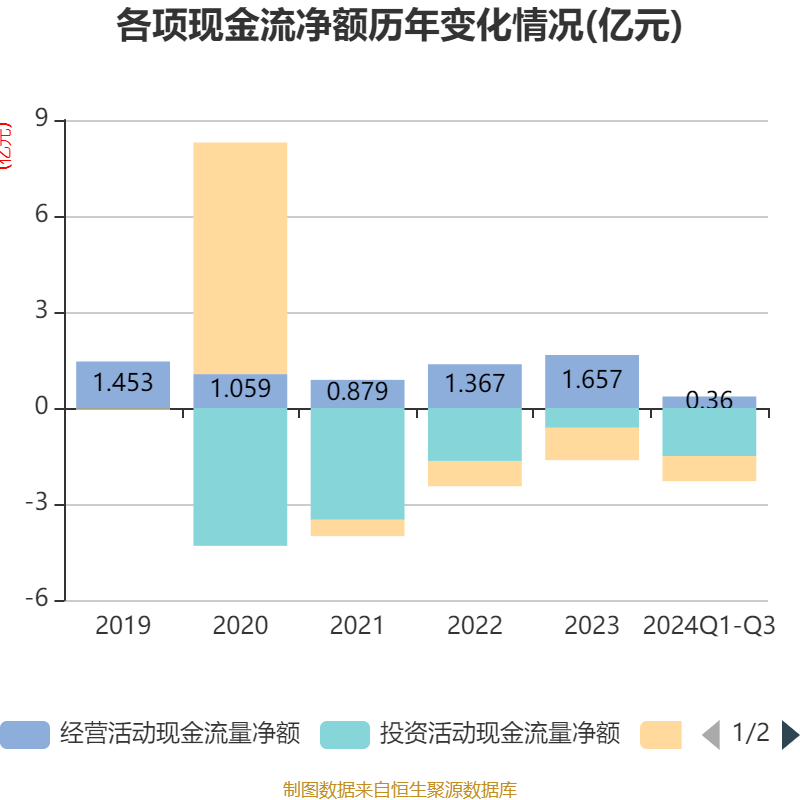 2024年前三季度,公司经营活动现金流净额为3599.93万元,同比增加5184.17万元;筹资活动现金流净额-7827.42万元,同比增加1255.73万元;投资活动现金流净额-1.5亿元,上年同期为5317.59万元。