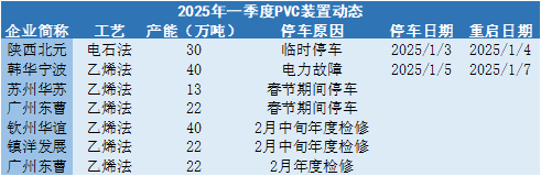 据隆众资讯,2025年1月前两周,中国PVC产能利用率在80%至81%区间波动,处于历史同期偏高水平。1月上旬PVC停车装置较少,仅华北一套30万吨装置、华东一套40万吨装置因故障短停。装置高开工叠加下游淡季弱需求,导致1月上旬PVC现货价格呈偏弱走势。展望后市,装置检修对供应压力的减缓作用依然有限。春节期间江苏华苏12万吨、广州东曹22万吨装置计划停车,预计1月常规检修损失量在1至2万吨左右,较2024年12月10.69万吨下降超80%。2月,受钦州华谊40万吨、镇洋发展22万吨、广州东曹22万吨装置年度检修影响,常规检修损失量预计在3至5万吨左右,仍处于偏低水平。