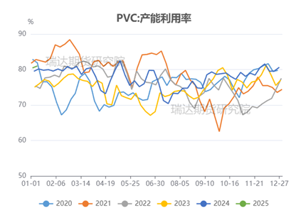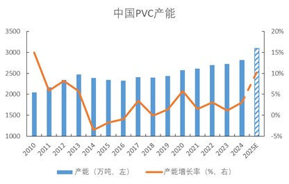 2024至2025年中国PVC行业仍处于扩能周期。2024年中国约有85万吨PVC装置投产,产能增速在3%左右,其中12月下旬投放的新浦化学25万吨装置已于2025年初逐步达到满产状态,持续为2025年一季度PVC供应贡献增量。受去年部分装置投产延期影响,2025年约有290万吨装置计划投放,产能增速达到近5年高位的10%左右。新增装置主要集中在第一、二季度投放,其中一季度新浦化学50万吨装置预计在2月投产,青岛海湾20万吨装置预计在3月投产。关注后续装置落地情况。