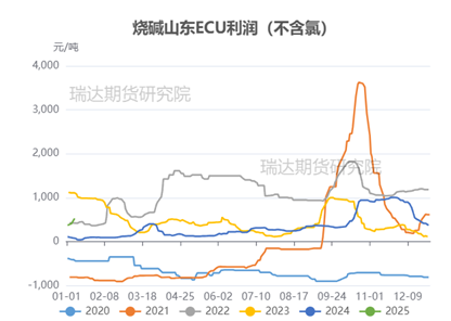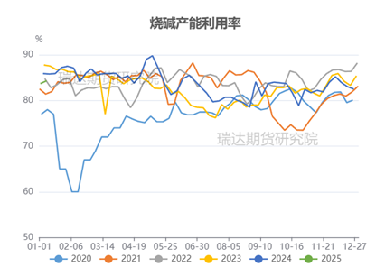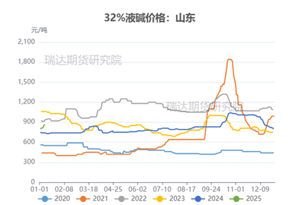 氧化铝是烧碱的最大下游。2025年氧化铝预计投产1030万吨,其中上半年计划投放680万吨;烧碱计划投产在500万吨左右,投放在时间上分布较均匀,受能耗“双控”政策影响实际落地产能或远低于计划值。氧化铝的备货需求及其与烧碱投产的不均衡,导致1月上旬烧碱主产区山东液碱价格走强。截至1月10日,山东32%液碱市场价格在870元/吨,折百价在2719元/吨左右,较年初上涨约8.75%。