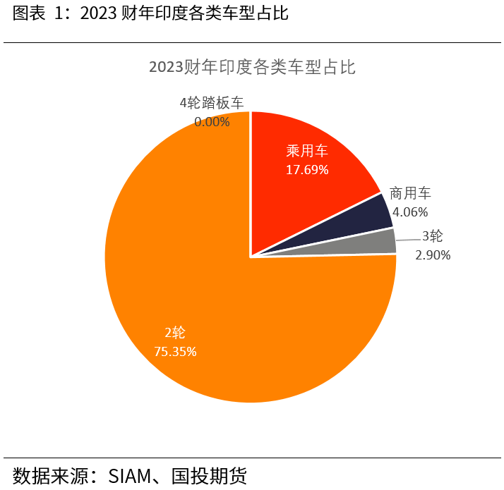 印度是一个以二轮电动车出行为主的国家,根据SMEV和SIAM的公开数据,其各类出行工具中,二轮车占比超四分之三,乘用车占比17.69%,三轮车占比只有2.9%。