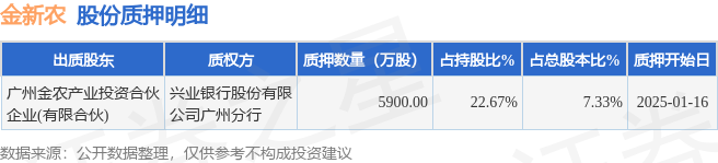 证券之星消息,金新农(维权)(002548)1月17日公开信息显示,股东广州金农产业投资合伙企业(有限合伙)向兴业银行股份有限公司广州分行合计质押5900.0万股,占总股本7.33%。质押详情见下表:
