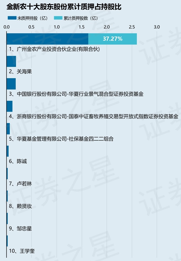截止本公告日,股东广州金农产业投资合伙企业(有限合伙)已累计质押股份9700.0万股,占其持股总数的37.27%。本次质押后金新农十大股东的累计质押股份占持股比例(占持股比例的计算以公司最新一期财务报表公布的十大股东的持股总数为基准)见下图: