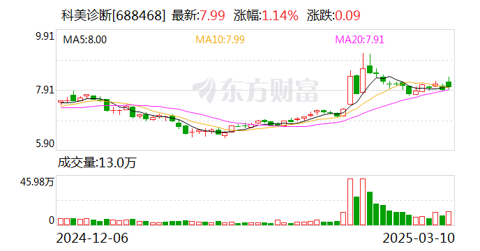 证券时报·数据宝统计显示,科美诊断今日收盘价为7.99元,上涨1.14%,日换手率为3.23%,成交额为1.05亿元,全天主力资金净流入92.12万元,近5日该股累计上涨1.52%,近5日资金合计净流出1441.86万元。