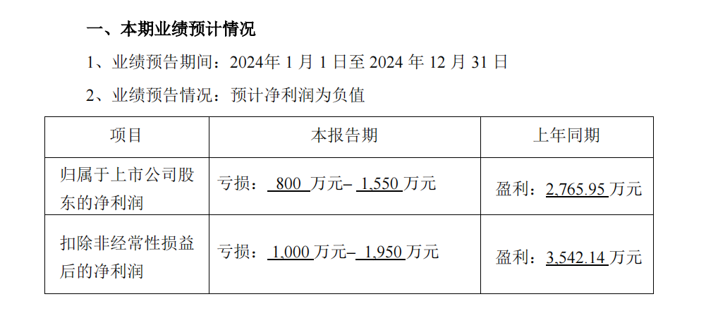 华神科技2024年度业绩预告显示,公司预计净利润为负值,归属于上市公司股东的净利润亏损区间为800万元至1550万元,而上年为盈利2766万元;扣除非经常性损益后的净利润亏损区间为1000万元至1950万元,上年为盈利3542万元。