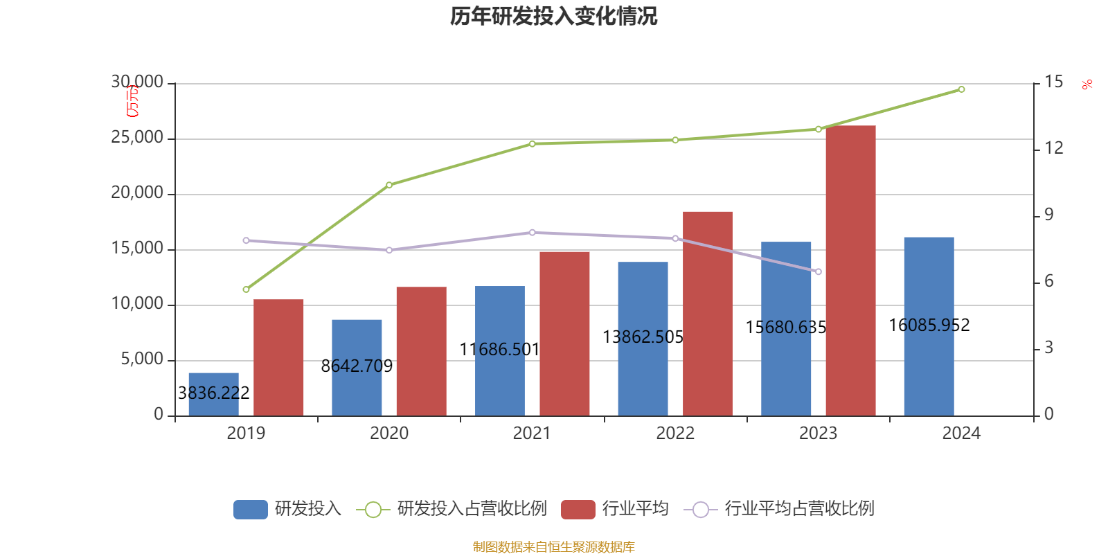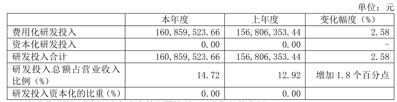 2024年全年,公司研发投入金额为1.61亿元,同比增长2.58%;研发投入占营业收入比例为14.72%,相比上年同期上升1.8个百分点。此外,公司全年研发投入资本化率为0%。