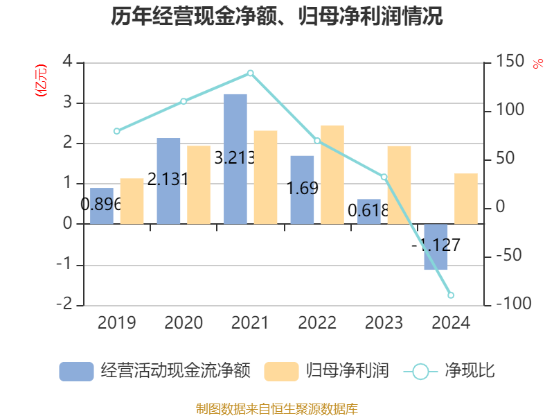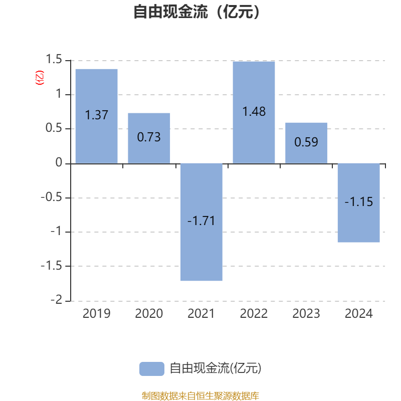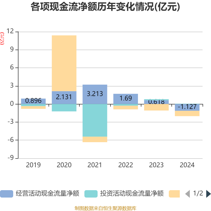 截至2024年,公司经营活动现金流净额为-1.13亿元,同比减少1.75亿元;筹资活动现金流净额-8880.43万元,同比增加1932.21万元;投资活动现金流净额521.26万元,上年同期为1753.97万元。