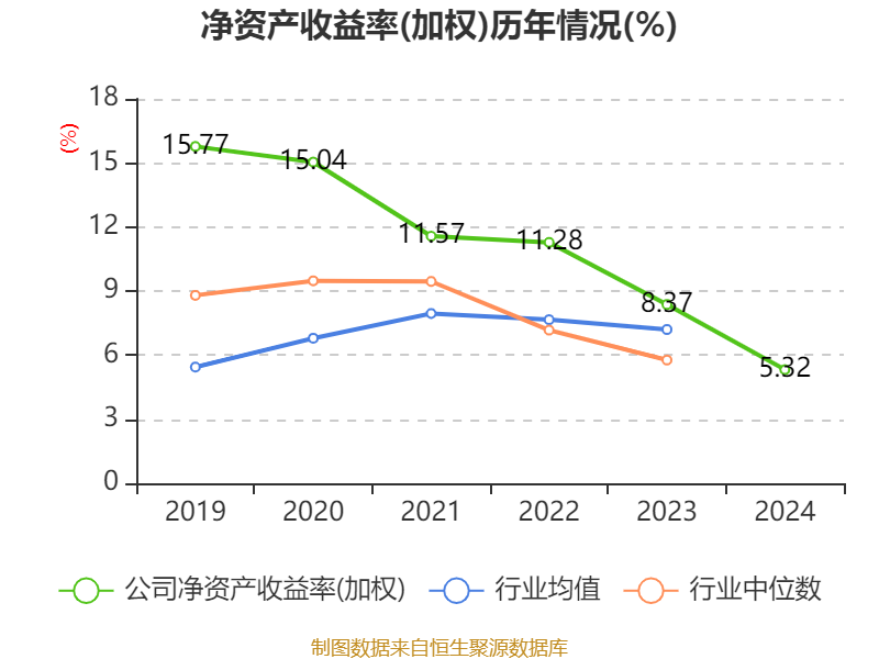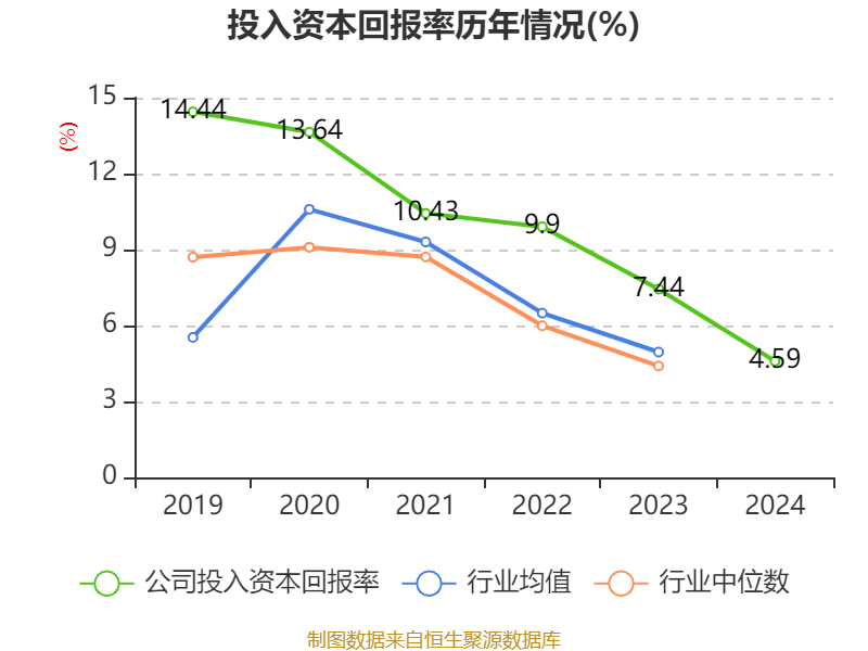 数据显示,2024年公司加权平均净资产收益率为5.32%,较上年同期下降3.05个百分点。公司2024年投入资本回报率为4.59%,较上年同期下降2.85个百分点。