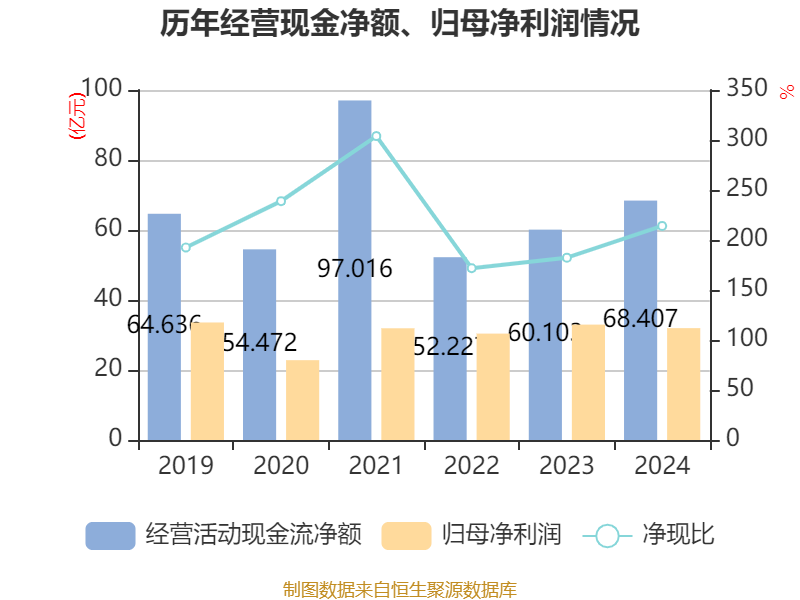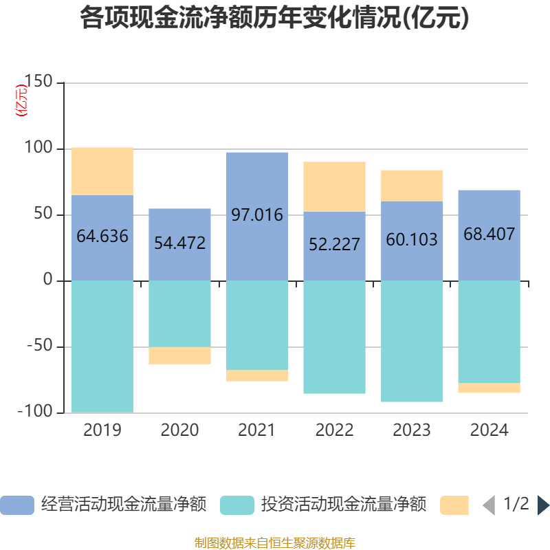 截至2024年,公司经营活动现金流净额为68.41亿元,同比增长13.82%;筹资活动现金流净额-7.37亿元,同比减少30.71亿元;投资活动现金流净额-77.63亿元,上年同期为-91.95亿元。