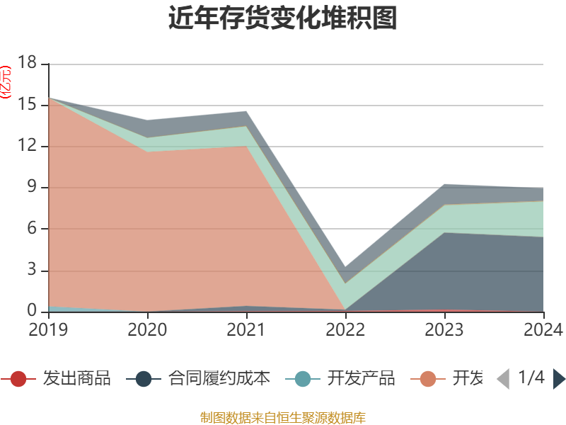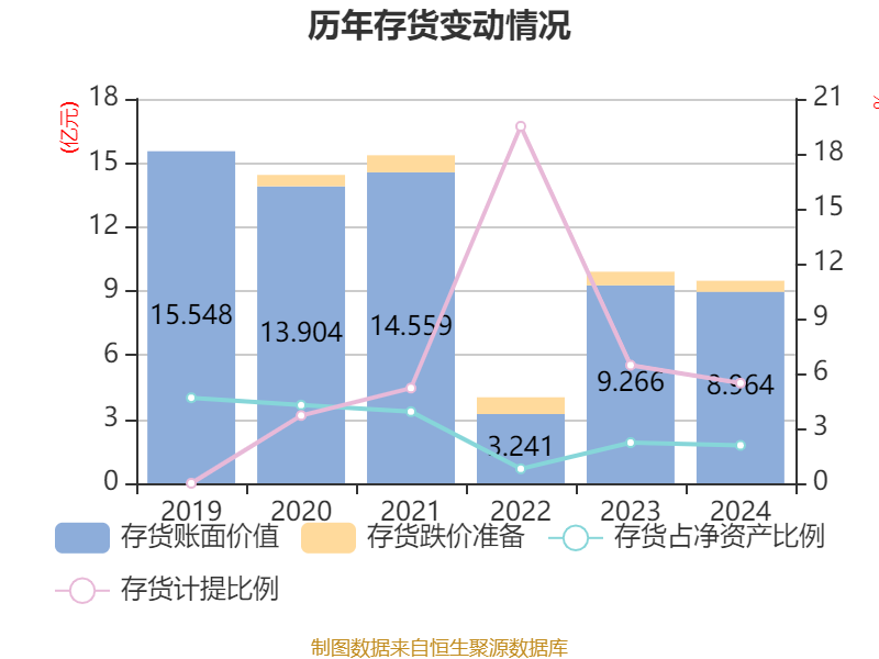 从存货变动来看,截至2024年末,公司存货账面价值为8.96亿元,占净资产的2.07%,较上年末减少3015.86万元。其中,存货跌价准备为5187.01万元,计提比例为5.47%。