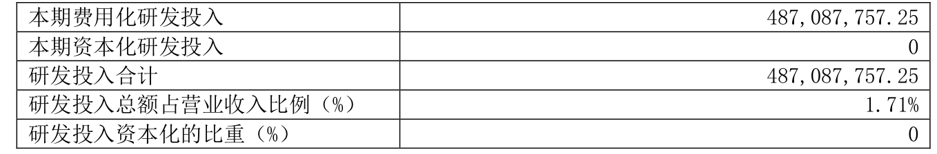 2024年全年,公司研发投入金额为4.87亿元,同比增长0.37%;研发投入占营业收入比例为1.71%,相比上年同期下降0.12个百分点。此外,公司全年研发投入资本化率为0%。