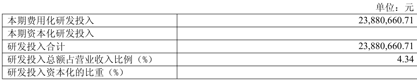 2024年全年,公司研发投入金额为2388.07万元,同比下降6.94%;研发投入占营业收入比例为4.34%,相比上年同期下降1.21个百分点。此外,公司全年研发投入资本化率为0%。