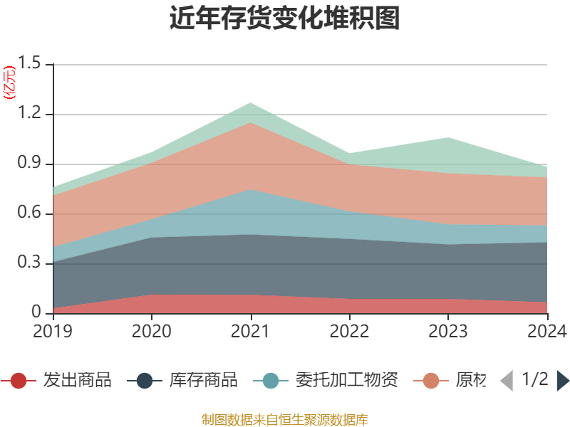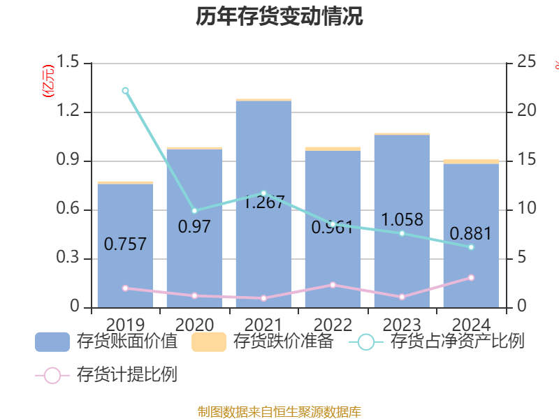 从存货变动来看,截至2024年末,公司存货账面价值为8811.88万元,占净资产的6.15%,较上年末减少1768.23万元。其中,存货跌价准备为274.91万元,计提比例为3.03%。