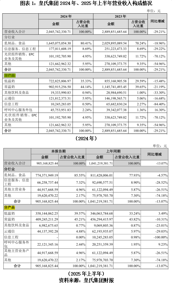 2025年半年报显示,皇氏集团的特色乳品业务表现亦不容乐观,如图表1所示,从分产品2025年上半年的收入表现看,除了低温奶同比微增3.49%,常温奶、其他饮料及食品分别同比下滑10.31%、23.01%。