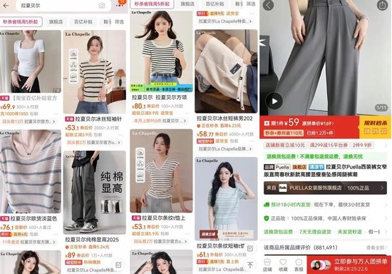 据观察,线上大部分拉夏贝尔授权店铺的热销服装售价在100-200元之间,和拉夏贝尔此前偏高端的品牌调性差异明显,部分热销款裙子、T恤、裤子低至百元以下,拼多多上一款价格59元的裤子已拼单超万件。此外,在1688上还能搜到大量拉夏贝尔直销工厂,单件批发价大多在50-100元左右。