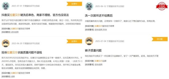一方面口碑持续滑坡,恒源祥、南极人、猫人花了十几年积攒起来的品牌美誉度加速流失。2018年,南极人一度创下14次登上国家质检部门、消费者协会质量“黑榜”的不光彩纪录;猫人也曾因衣服开裂等问题遭致大规模批评。拉夏贝尔刚开始做贴牌生意没几年,差评也在急速累加,黑猫投诉【下载黑猫投诉客户端】平台上搜出的超千条结果中,近期的投诉大多集中在褪色、大量起球等质量问题,以及退货困难、客服态度差等售后问题上。
