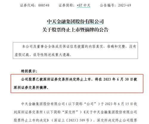 公告显示,中天金融集团股份有限公司于2023年6月15日收到深圳证券交易所《关于中天金融集团股份有限公司股票终止上市的决定》(深证上〔2023〕509号),深交所决定终止公司股票上市。
