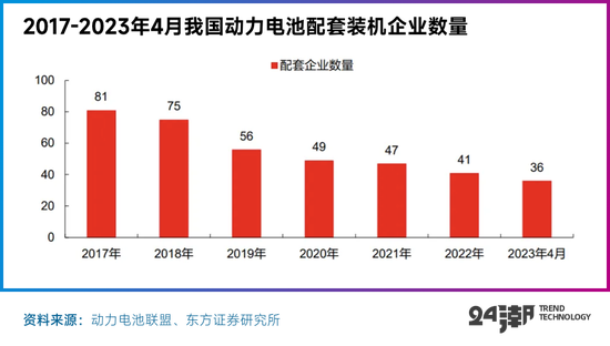 据东方证券统计,仅过去五年我国动力电池行业在经历大洗牌后,能够配套车型的电池生产企业数量已经从2017年的81家降至36家(2023年4月),降幅达55.56%。