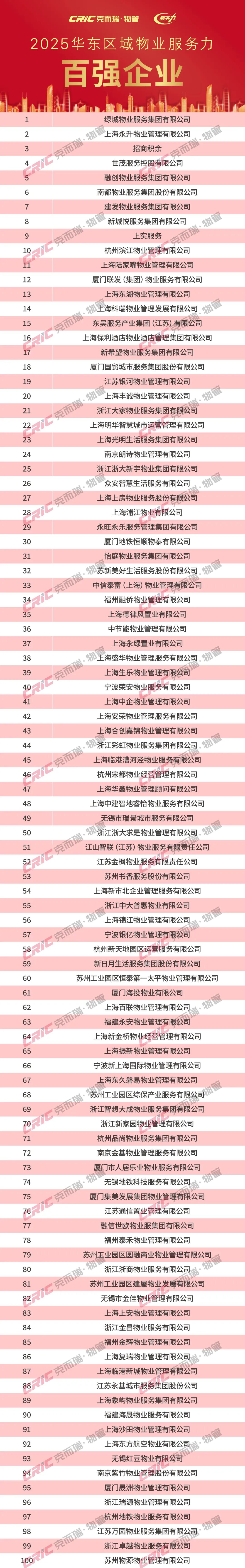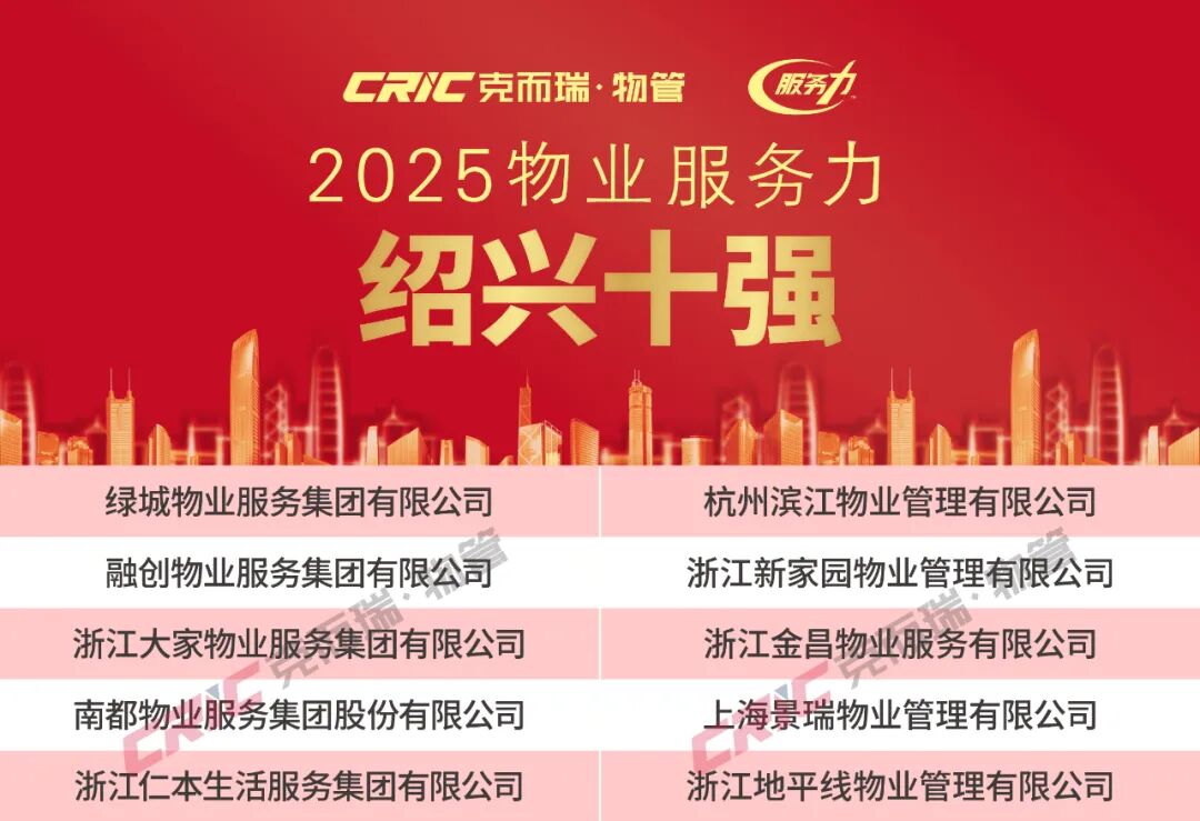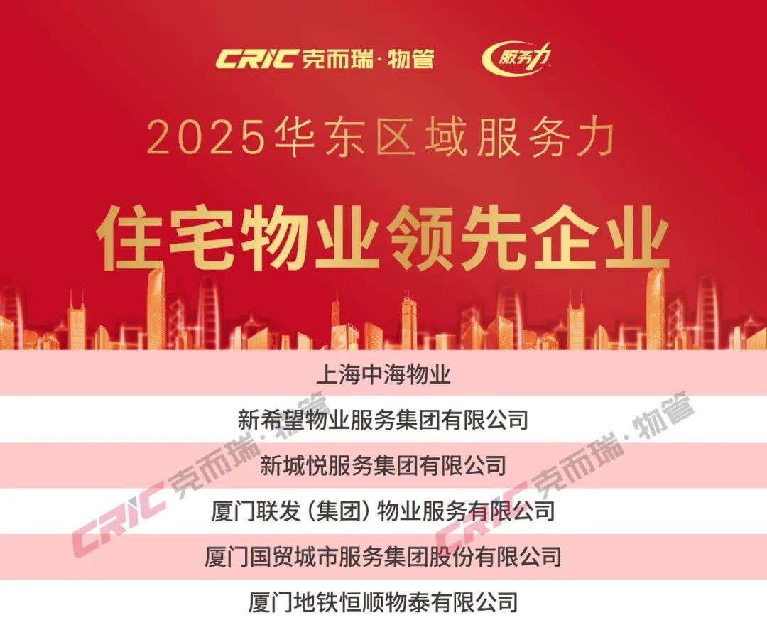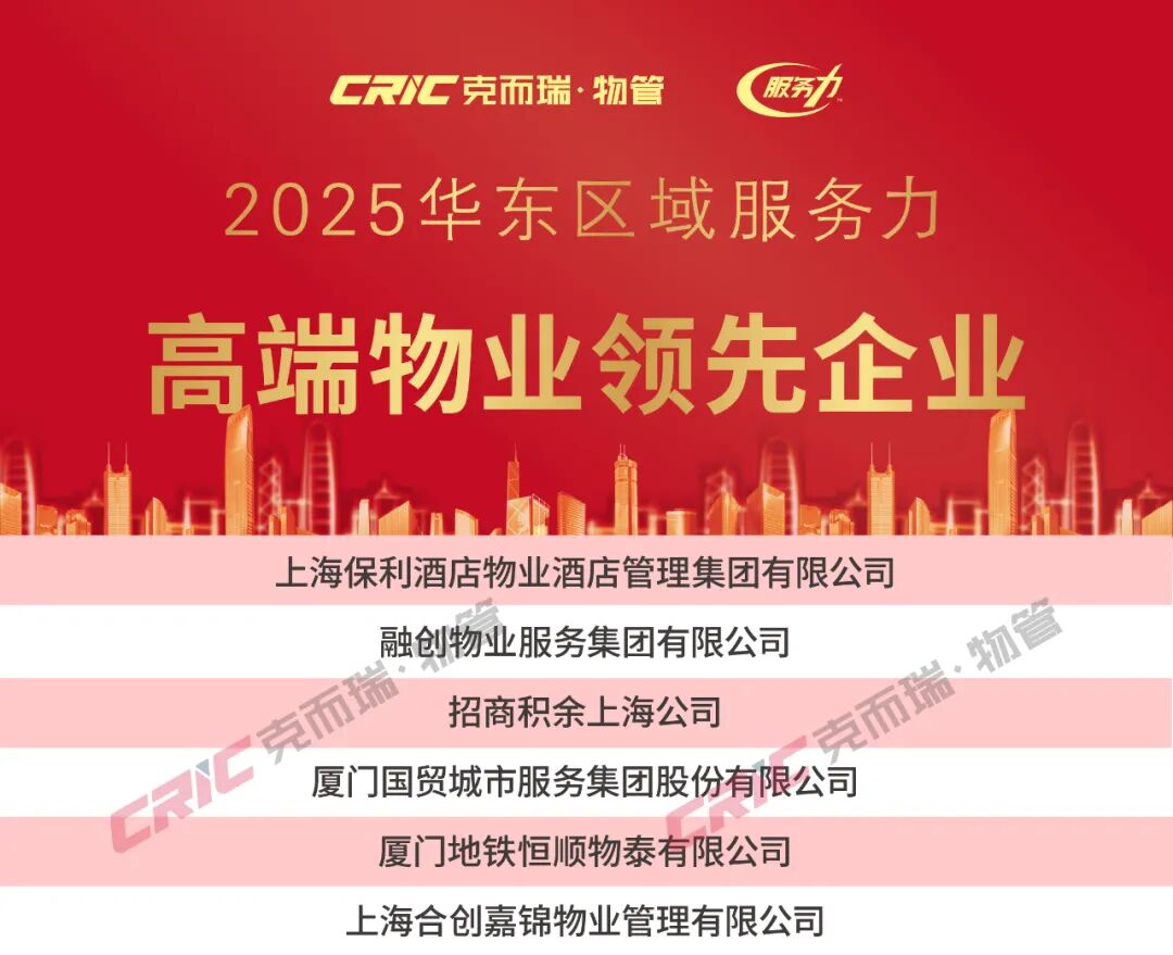 2025年11月20日,克而瑞物管发布「2025年华东区域物业服务力系列研究成果」。同期揭晓了“2025华东区域物业服务力百强企业”、“2025上海市物业服务力五十强企业”、“2025江苏省物业服务力三十强企业”、“2025浙江省物业服务力三十强企业”、“2025福建省物业服务力三十强企业”、“重点城市十强企业”(苏州、南京、无锡、杭州、宁波、绍兴、厦门、福州)以及“重点细分领域领先企业”,为华东区域物业服务力树立了风向标。(文末附2025年华东区域物业服务力系列榜单)