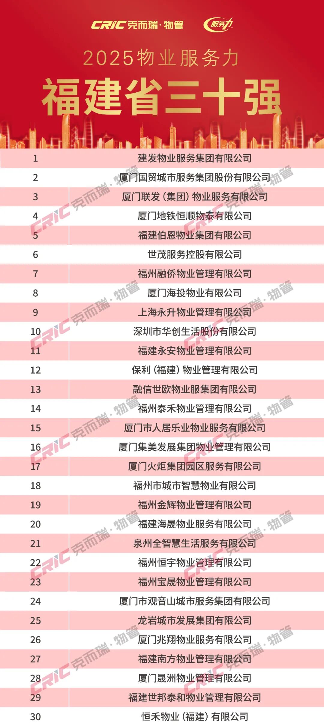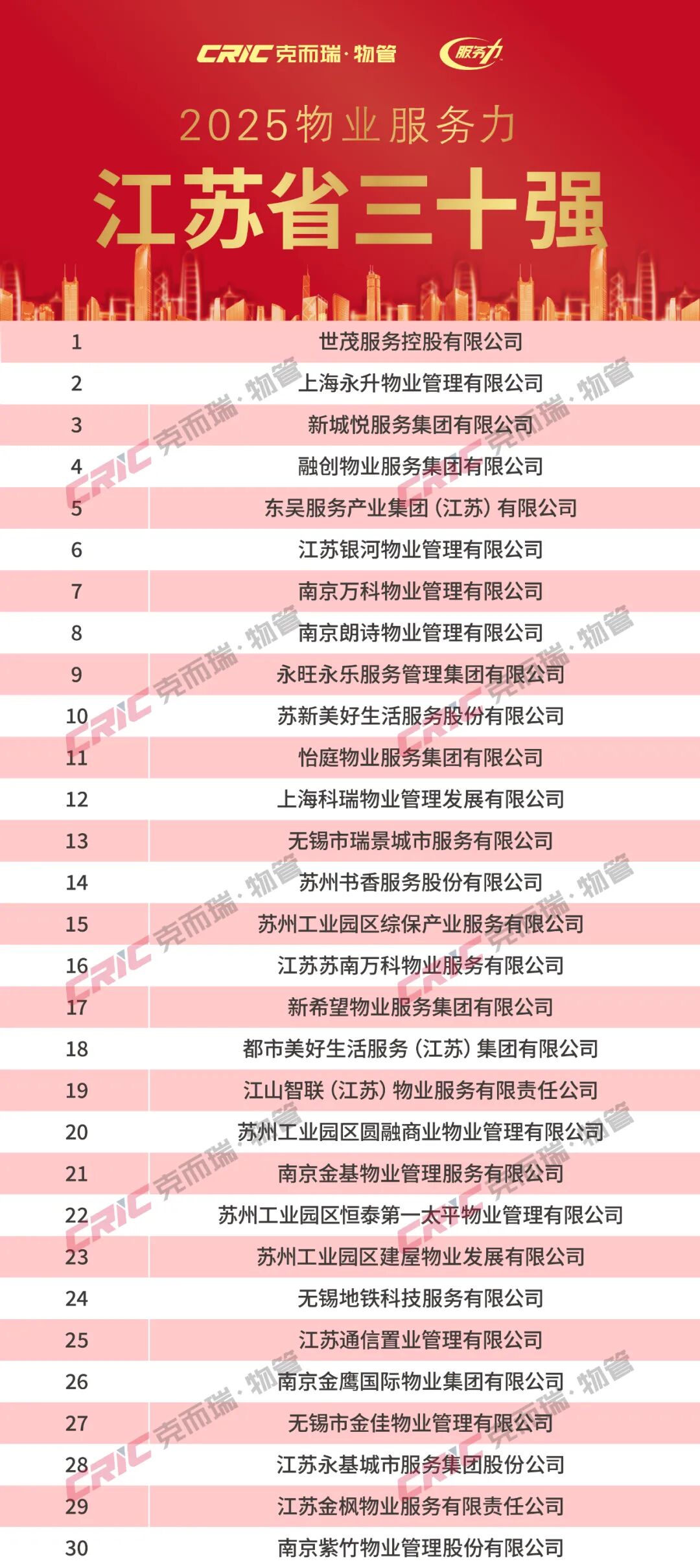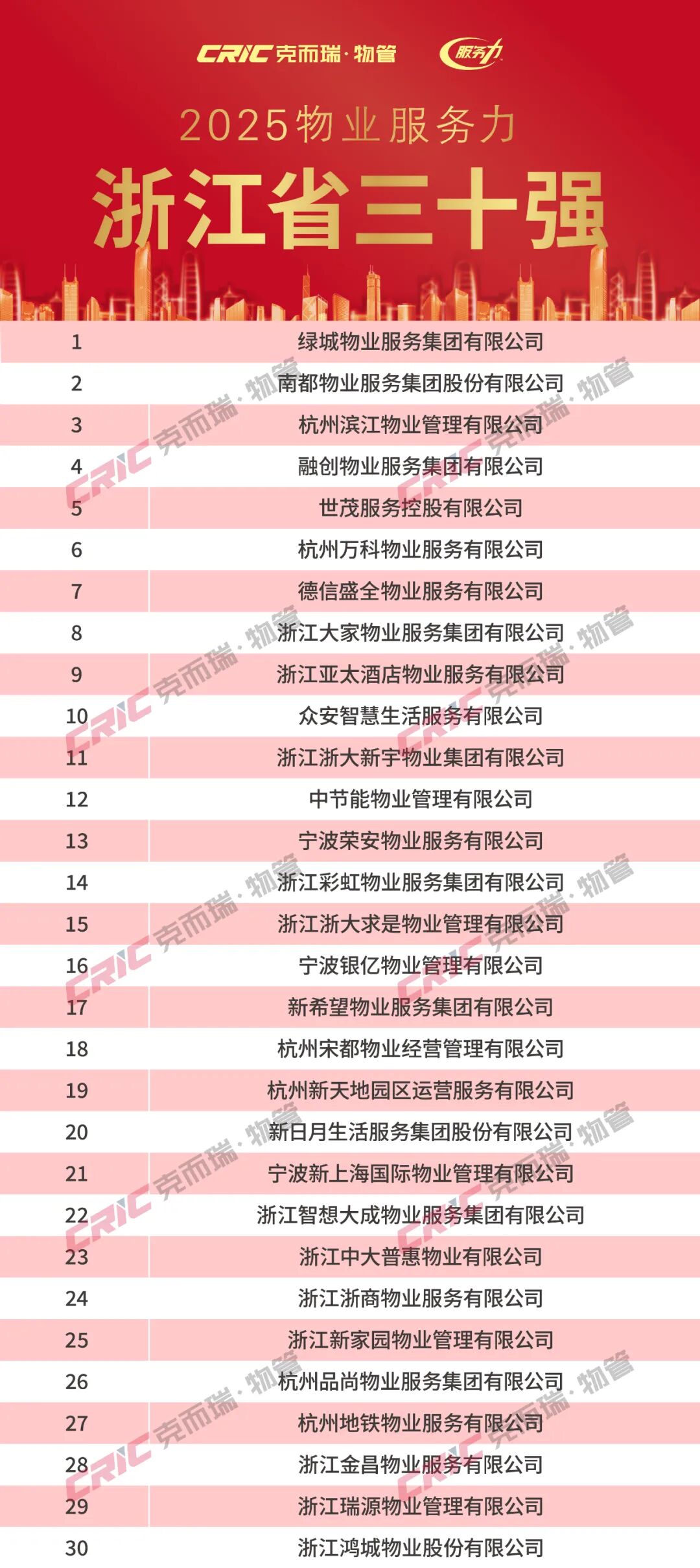 2025年11月20日,克而瑞物管发布「2025年华东区域物业服务力系列研究成果」。同期揭晓了“2025华东区域物业服务力百强企业”、“2025上海市物业服务力五十强企业”、“2025江苏省物业服务力三十强企业”、“2025浙江省物业服务力三十强企业”、“2025福建省物业服务力三十强企业”、“重点城市十强企业”(苏州、南京、无锡、杭州、宁波、绍兴、厦门、福州)以及“重点细分领域领先企业”,为华东区域物业服务力树立了风向标。(文末附2025年华东区域物业服务力系列榜单)