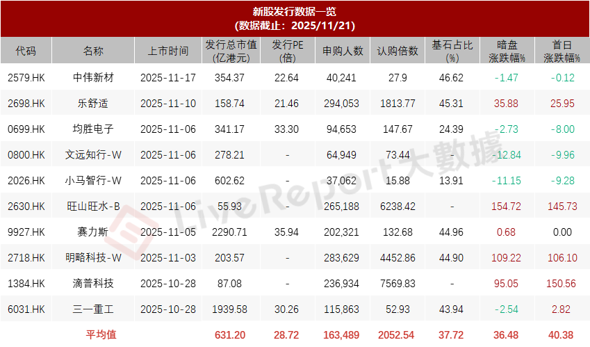 近10只新股暗盘平均上涨36.48%,首日平均上涨40.38%;从近期暗盘及首日的涨跌均值来看,收益持续下降,近期AH新股遇冷明显,其他新股虽也有所降温,但如创新实业、量化派及海伟股份等非AH股认购还维持较高热度。